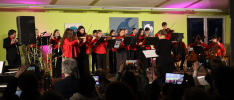 Beschwingt eröffnete der Schulchor den Abend mit „Count on Me“ und „I Have a Dream“. Auch der Jubiläumschor, der sich anlässlich des 125-jährigen Schuljubiläums gegründet hat, bereicherte das Programm mit dem Lied „Light of Grace“. Zu den bewährten Konzertbeiträgen zählten die Gitarren-AG mit ihren zarten Klängen bei „Llorando se fue“ und „Can’t Help Falling in Love“ sowie das Kammerorchester, das mit der Titelmusik aus „Game of Thrones“ und „Zooster’s Breakout“ aus dem Film „Madagaskar“ für begeisterten Applaus sorgte.