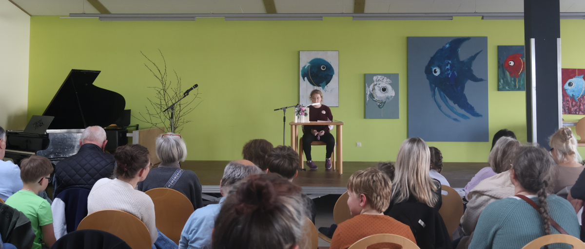 Moderiert von Frau Martin konnte das aufmerksame und interessierte Publikum insgesamt in sieben Büchern und selbstgeschriebenen Texten hineinschnuppern, die von Schülerinnen der Jahrgänge 6- 8, Frau Goosmann, Frau Berger und Frau Allert-Gatzen präsentiert wurden, welche die Gruppe aus der Begabtenförderung leitet. Eingerahmt wurde das Programm durch kurze Klavierstücke von sechs SchülerInnen, die von Frau Deike Weber unterrichtet werden. Dies war eine perfekte Ergänzung zu den Lesungen.